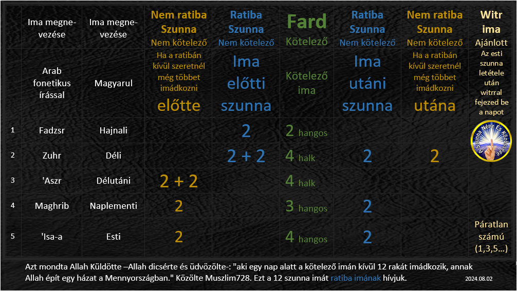 Kedves testvéreim, ez a táblázat mutatja a Kötelező (Fard), és az önkénytes (szunna) imákat.